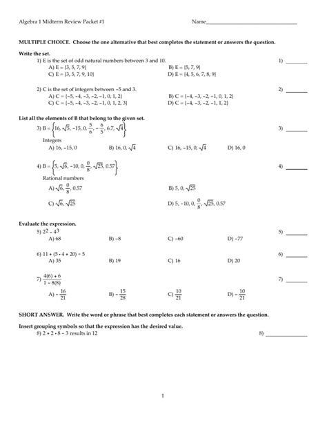 Download Algebra 1 Midterm Review Answer Packet Doc